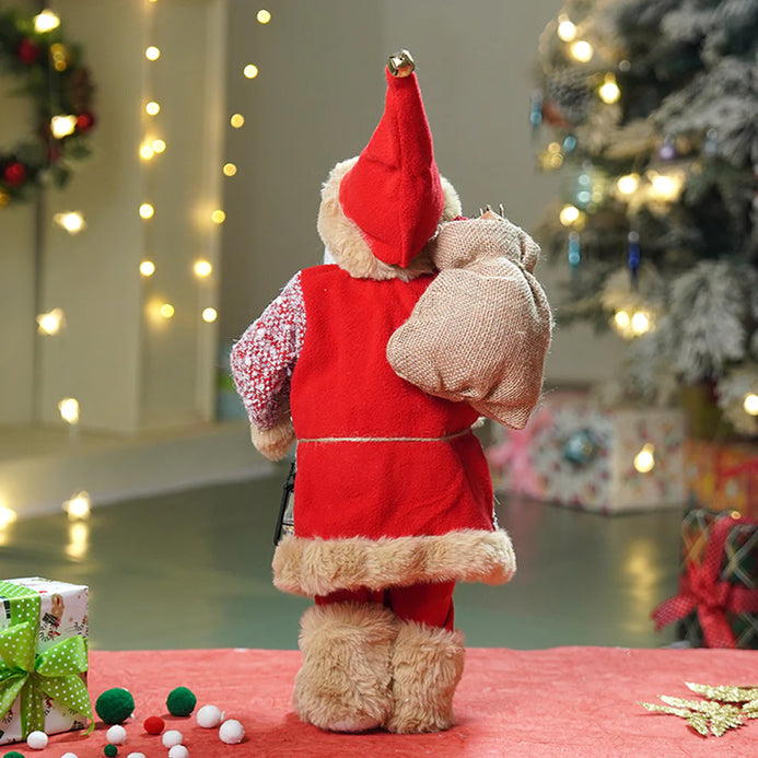 2. Detailing: Designed with soft faux fur fabric, knit textures, and rope accents, this Santa carries a burlap sack filled with gifts on his shoulder while holding a vintage-style lantern in his hand, symbolizing light, love, and the joy of giving. The combination of soft beige tones and festive reds adds a cozy and timeless Christmas appeal to any décor setting.