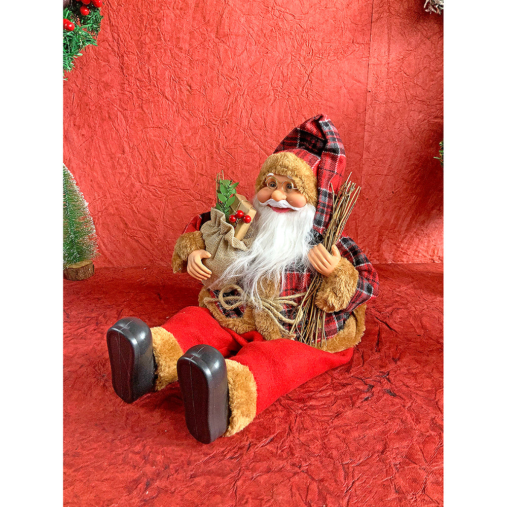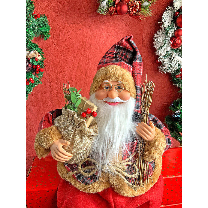 1. Exclusive Design: This Exquisite and overly attractive sitting Santa in classic plaided attire with premium Furry Look holding and adorning the most cutest christmas sack and realistic looking woodn sticks is an eye catcher when placed on any table or your favourite corner of your house to accentuate your christmas decor.