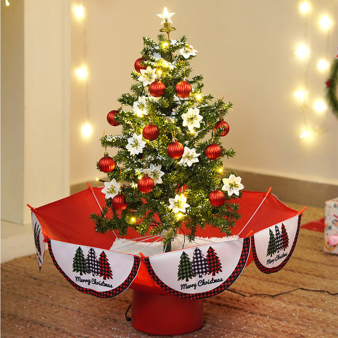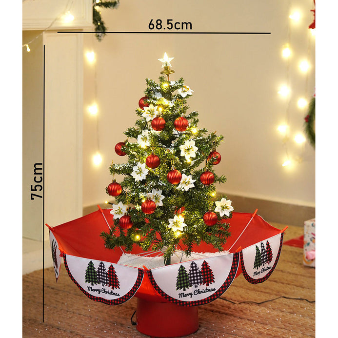 4. Detailed Design: Standing at 2.5 feet, this décor piece features a beautifully decorated Christmas tree with rich pine foliage, colourful ornaments, LED lights, and a star topper completing the look. The red umbrella-style base enhances the overall appeal, making it a standout highlight for holiday celebrations.