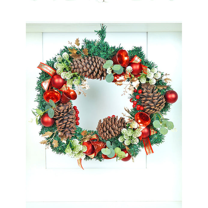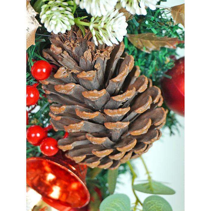 1. Unique Designed Wreath: This exquisite and premium Wreath would add volume and magic to any space where it is put up. The classic and rich mix of Big size dark wooden Pinecones , dense bushy fillers, with dense generous greens, delicate designed red bells, gold and red ribbon bows add a lot of classic beauty to the piece. Just open up the branches for a more fuller and enticing look.
