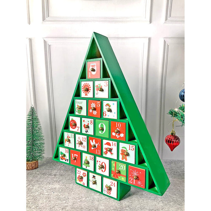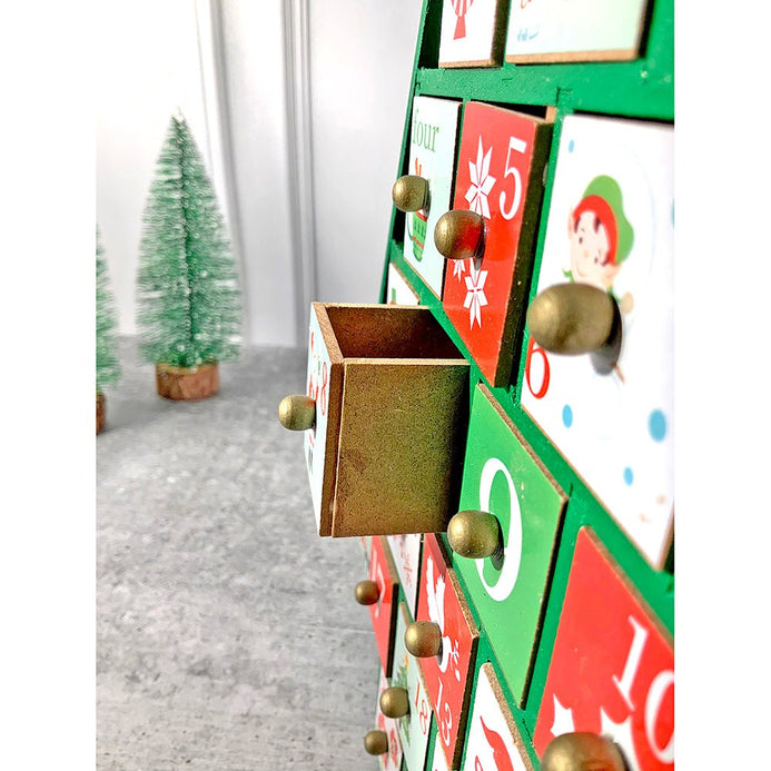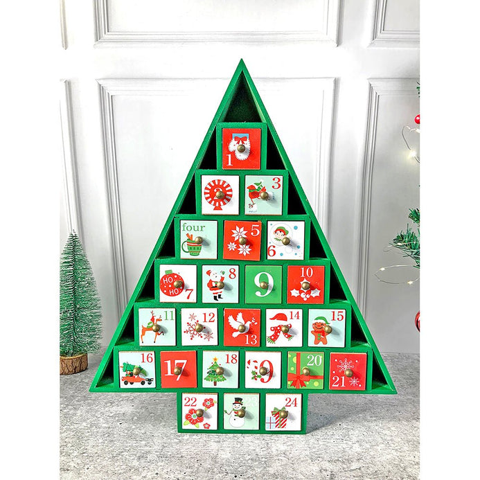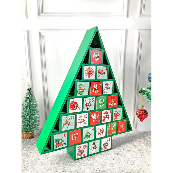 1. 24 Days Advent Calendar: Celebrate the joy of the season with this beautifully crafted wooden Christmas tree advent calendar. Shaped like a Christmas tree, this advent calendar features 24 colorful, numbered drawers, each decorated with festive holiday designs like Santa, snowflakes, and Christmas ornaments.