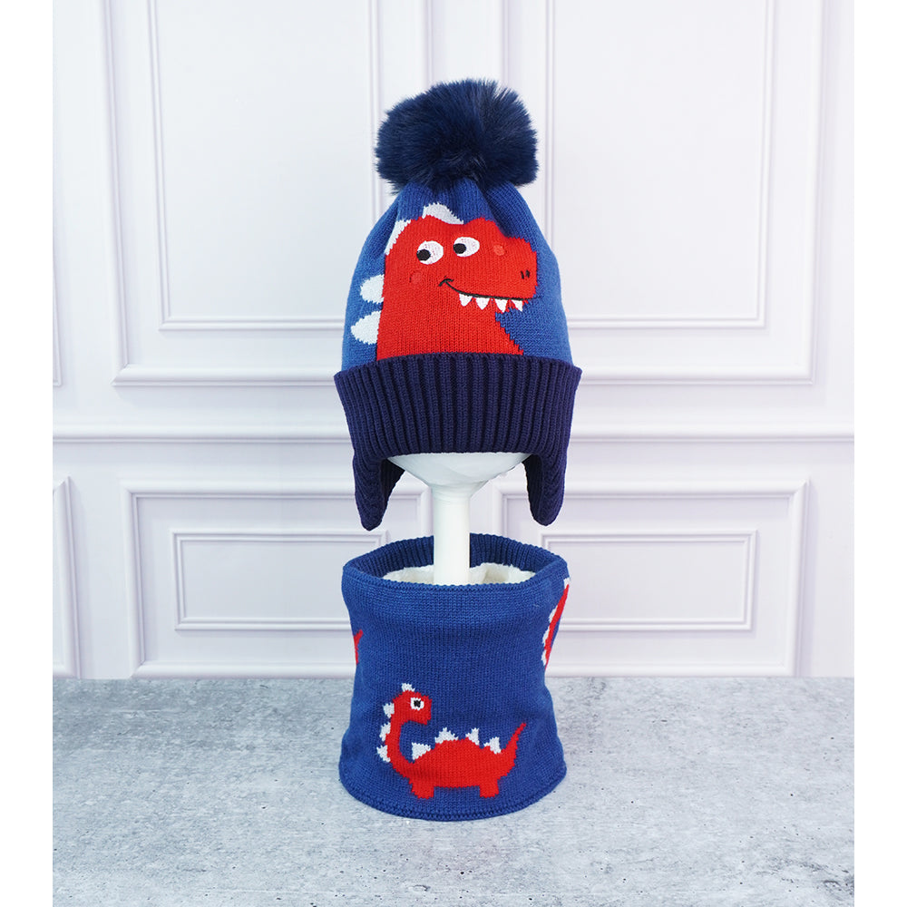 2Pcs Blue Red Face Dino Themed Beanie Winter Cap With Matching Neck Cuff Style Muffler