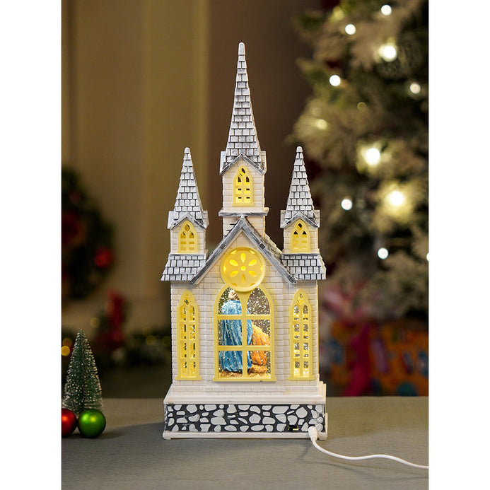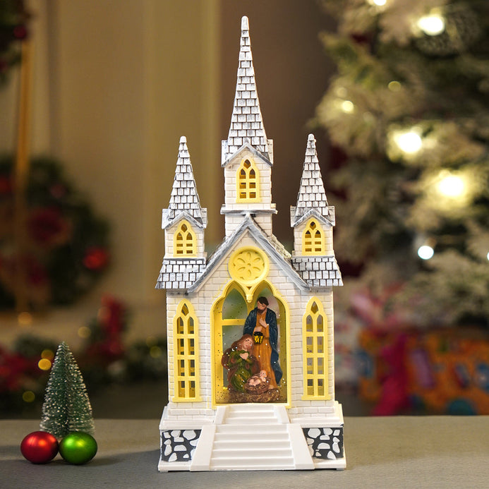 3. Glowing Illumination: When illuminated, the cathedral softly glows through its detailed window cutouts as glitter swirls gracefully with the moving water inside, creating a mesmerizing celestial sparkle that fills your home with the warmth and spirit of Christmas.