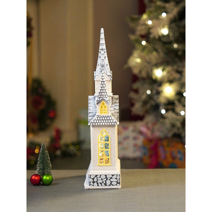 1. Enchanting Musical Lit Décor: This elegant Gothic-style Musical Lit Church captures the sacred beauty and peace of Christmas. Crafted in an ivory finish with tall steeples, yellow-tinted window accents, and intricate architectural detailing, making it centrepiece for your festive décor collection.