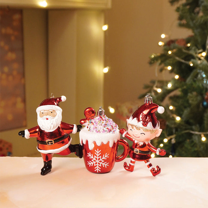 1. 3pcs Exclusive Tree Ornaments: This piece is a total stunner with its cute details of an amazing set of happy Santa, Naughty Elf and a marshmallow filled Cup makes it a perfect set of ornaments for your christmas tree. The beautiful combination of shiny bright metallic red, white, and gold adds a perfect whimsical touch to your Christmas décor.