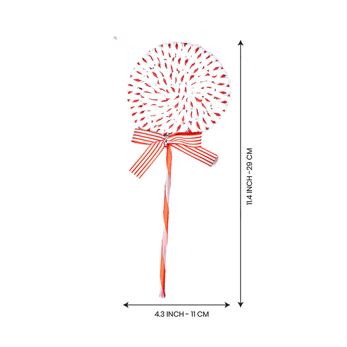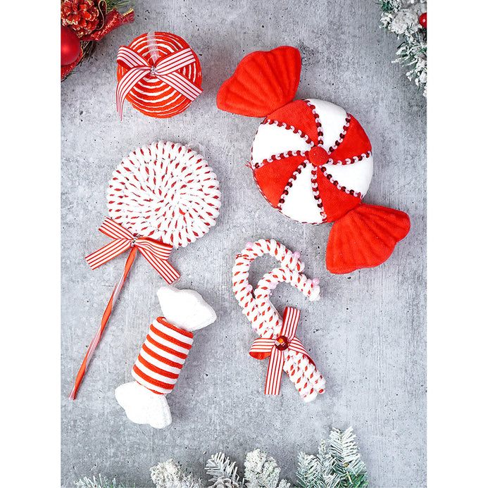 3. Size: The big Chocolate is 10 inches in ht x 5 inches in width. The Rectangular toffee is 6 inches in ht x 4 inches in width. The Red candy canes are 6.5 inches in ht x 4 inches in width, The ball is around 3.5 inches in diameter, The Pinwheel lollipop is 11.5inches in height.