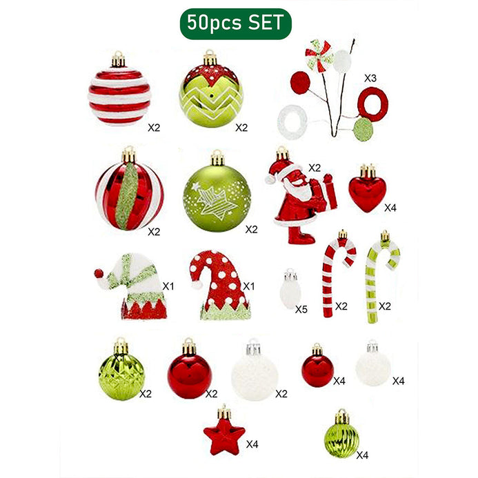 1. 50pcs Christmas Decoration : An exclusive and royal tree decor in the theme of the Naughty Elf in sage green , red and white. printed themed premium box set of medium size 50 pieces christmas tree ornaments which offers a good range of mix designs and Shapes of Christmas Balls in the most unique and exclusive range.