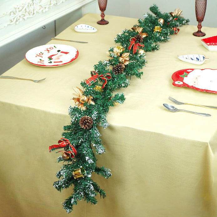 1. Classic Gold & Red Christmas Theme: This beautiful bushy and richly decorated garland is a festive highlight for any space. The combination of gold ornaments, traditional red–green bows, bright red cherries, snow dust fillers, and natural pinecones blends seamlessly with the lush deep green branches. The mix of gold and red adds a warm, luxurious Christmas charm, making this piece perfect for elevating any festive setup.