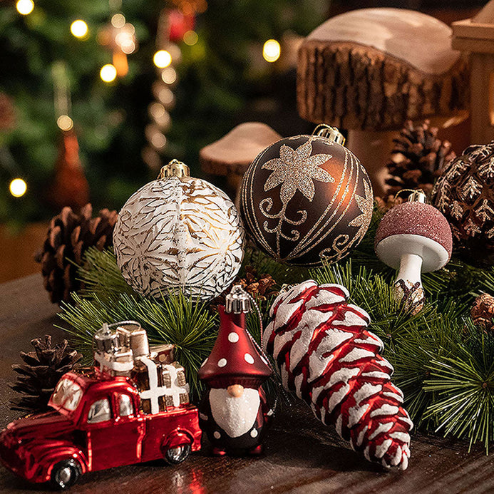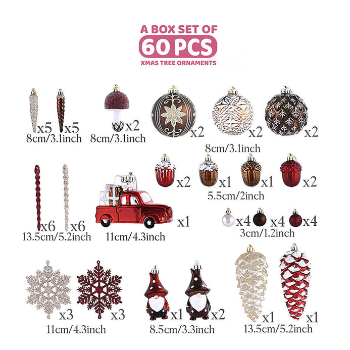 1. 60 pcs Christmas Decoration Balls Set : A premium and unique rustic vintage themed Deep Maroon, Gold & Copper Shimmer themed box set of big size 60 pieces christmas tree ornaments which offers a good range of mix designs and Shapes of Christmas Balls in the most unique and exclusive range.
