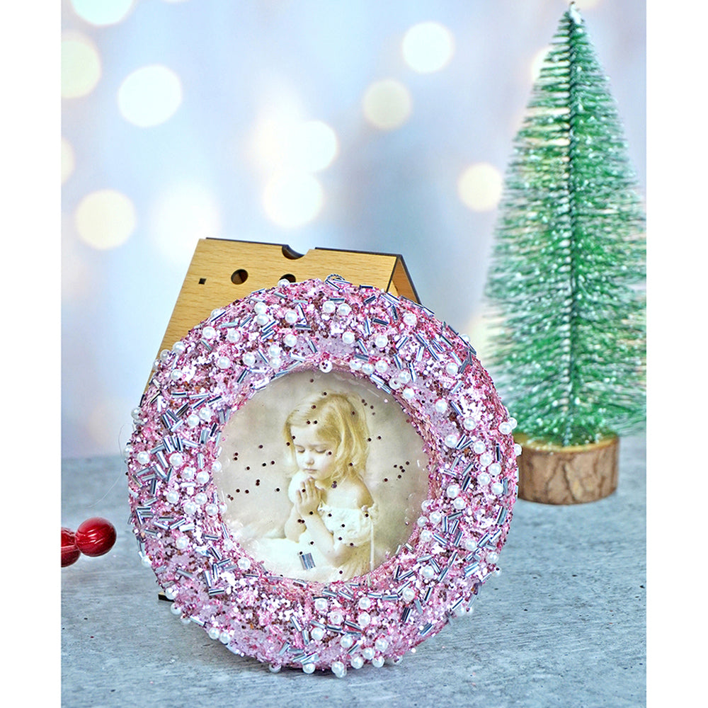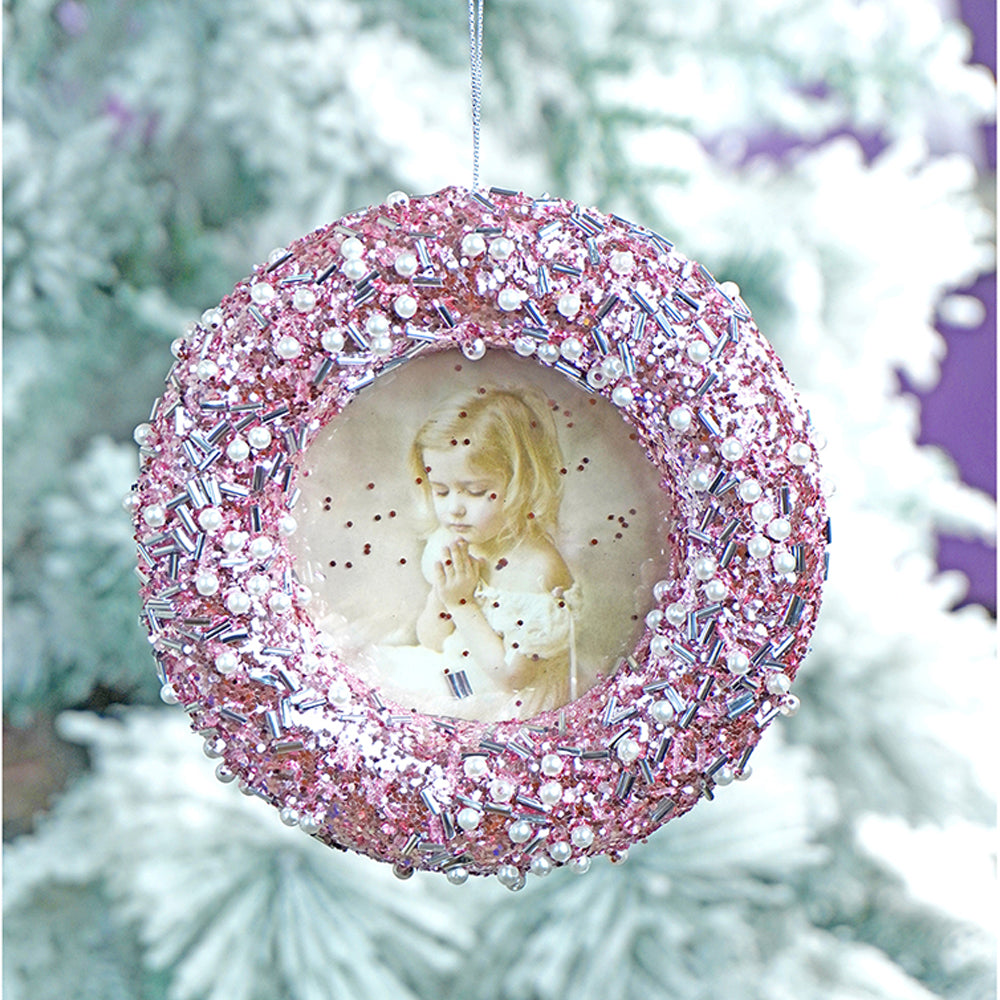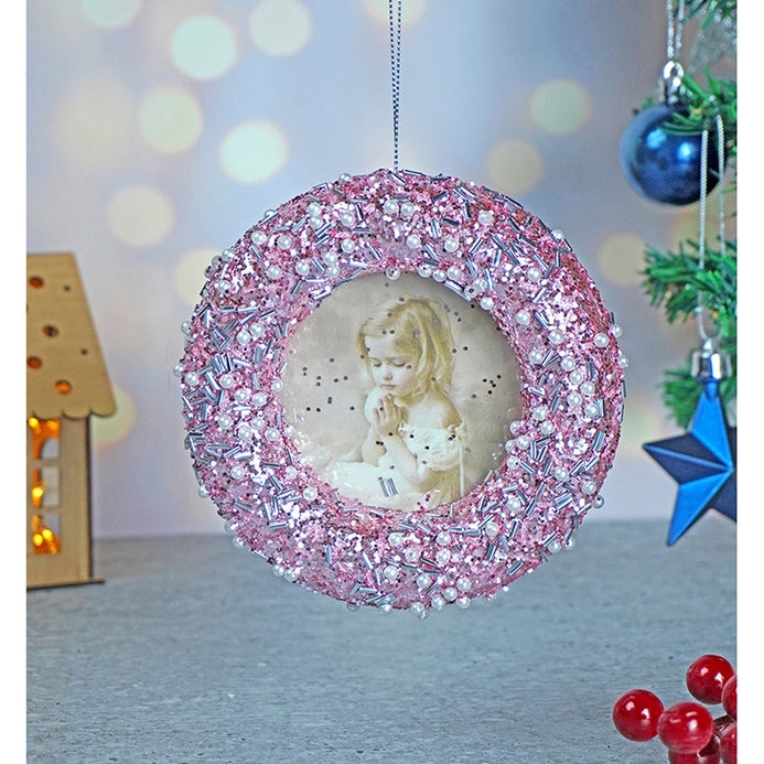 1. Unique designed vintage themed Tree Ornament: Add a touch of timeless elegance to your holiday Decor with this stunning beaded Christmas frame ornament. Featuring intricate pearl and metallic beadwork around a circular frame, you cud beautifully showcase your little ones pic inside it.