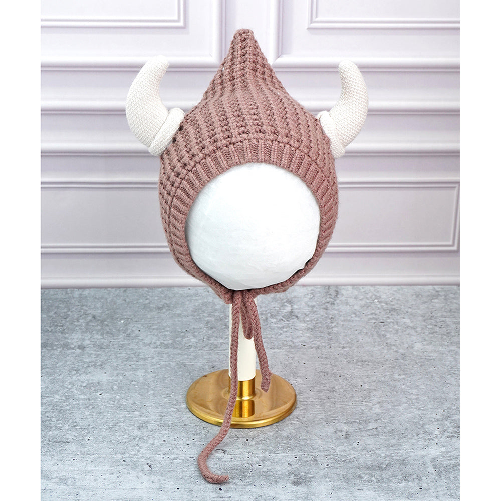 Brown Baby Horns Knitted Soft Woolen Winter Cap With Tie Up | 6-18 Months