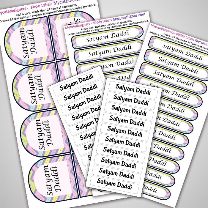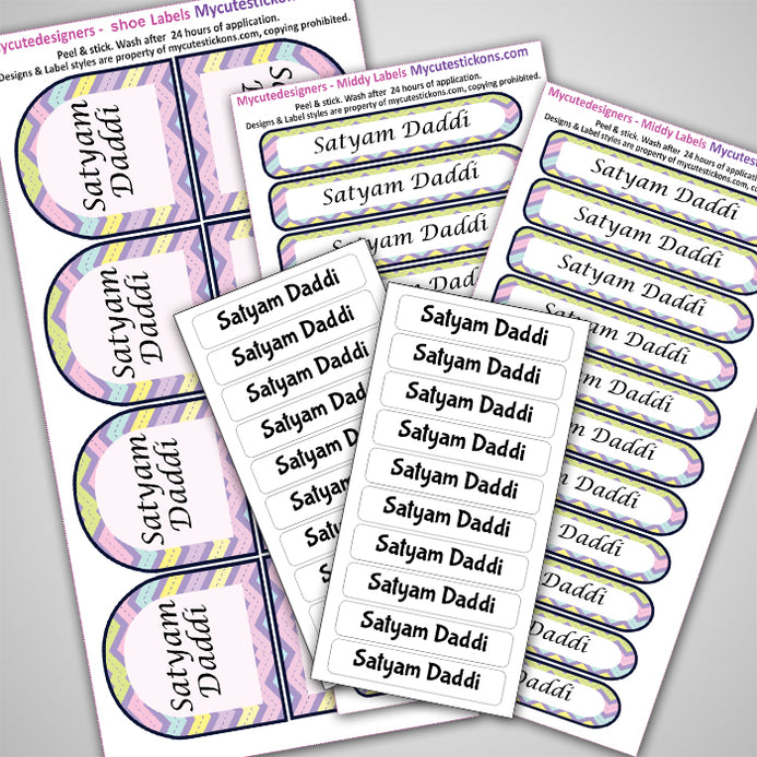 It’s a small pack of assorted labels for your few days of camping baggage needs, The Iron On Clothing Labels, Shoe Labels and minnies are all a part of this pack. It's great for starters too, who wish to try our labels. The pack contains 15 iron-on, 2 pairs of shoe labels, 20 Medium labels.