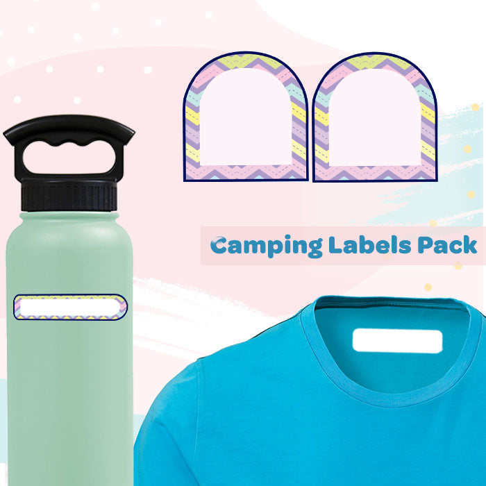 It’s a small pack of assorted camp labels and water bottle stickers, for your few days of camping baggage needs including, iron on clothing, shoe labels etc are all a part of this pack.