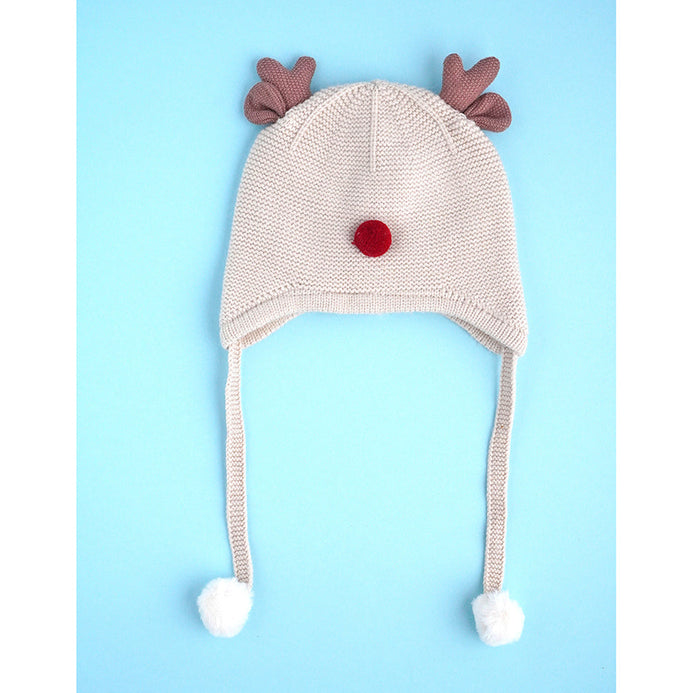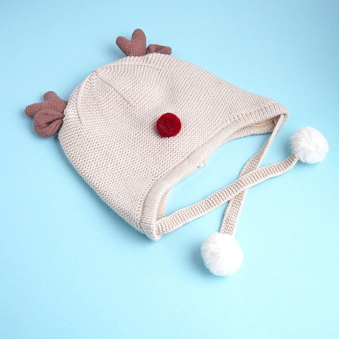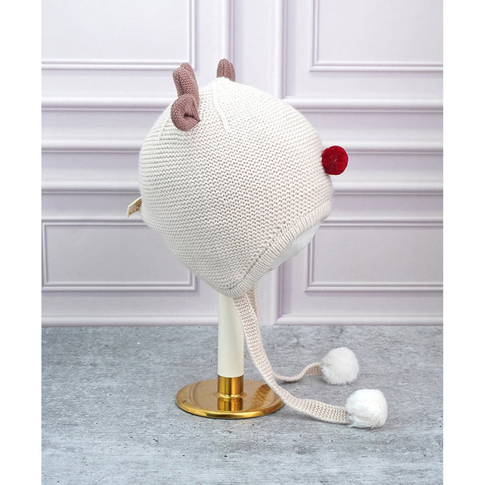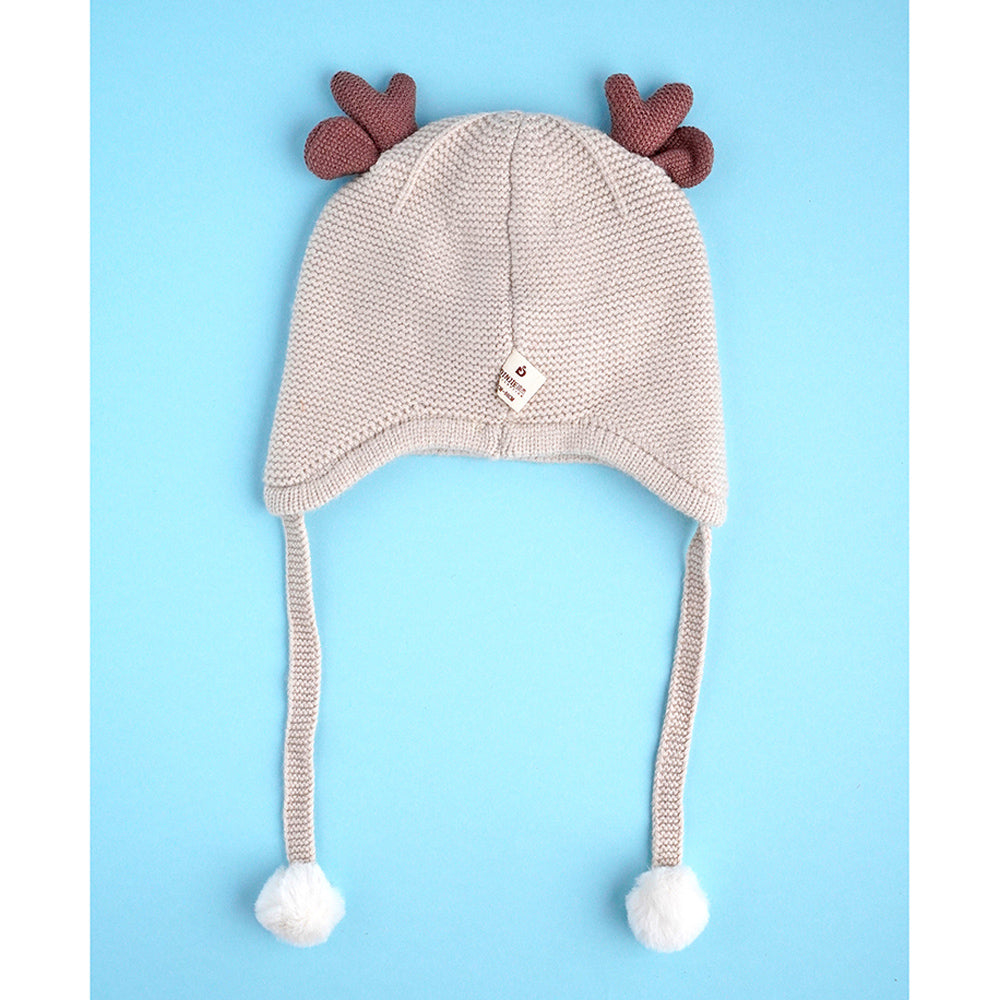 Cream Baby Antler Knitted Soft Woolen Winter Cap With Tie Up | 6-18 Months