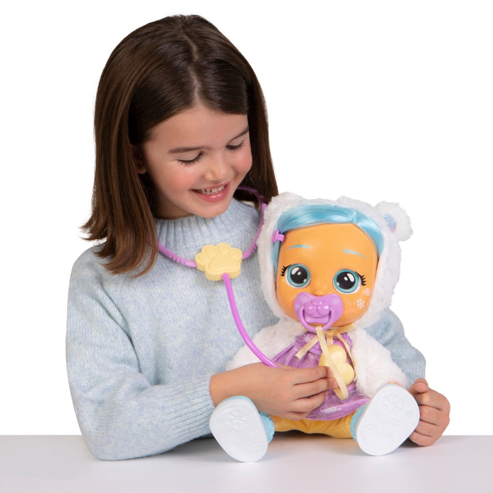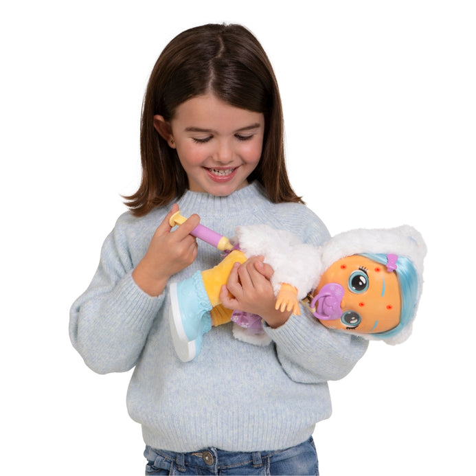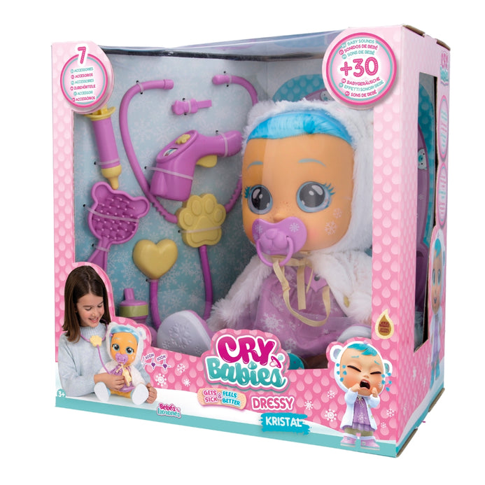 Cry Babies Kristal is sick! Can you take care of her? Give her the right medicine and some cuddles to help her feel better! If she gets a cough, give her the medicine to help her stop coughing. If she gets a fever, you will need to dab her forehead with the wet cloth to help cool her down. When red spot will appear on her face, give her the injection to make them disappear! Like all Cry Babies, Kristal also cries real tears when you remove her dummy and makes realistic baby sounds. 6 accessories included; a dummy, a stethoscope, an injection, a cloth, cough syrup and a thermometer.