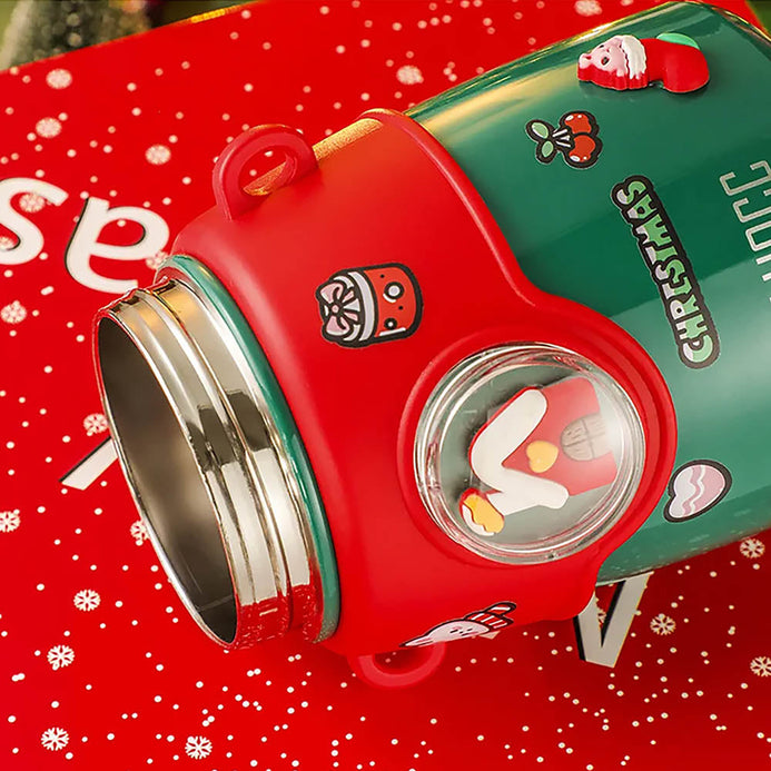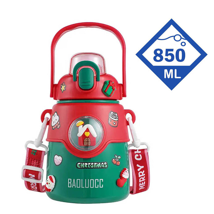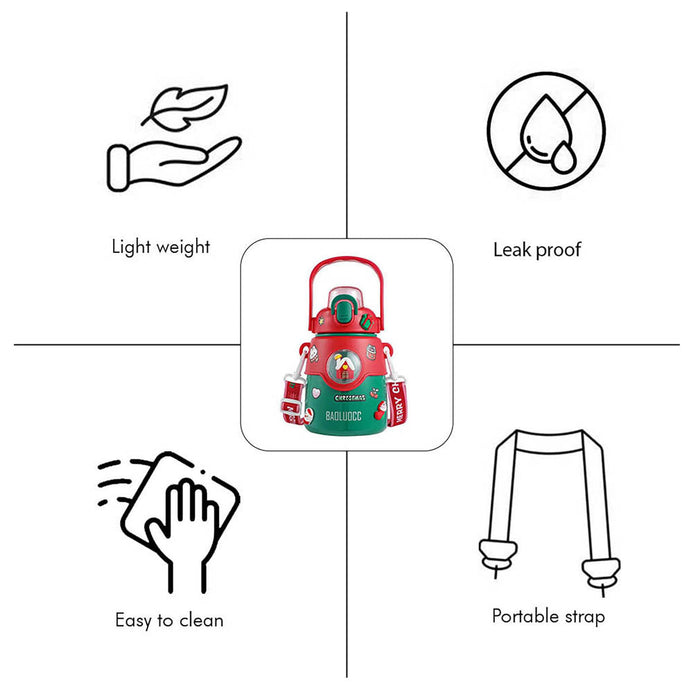 5)Strap & Handle: This cute water bottle comes with a thick green strap filled with xmassy printed elements and a thick plastic handle which makes it very easy and convenient for the child to carry the bottle if the child does not want to use a strap.