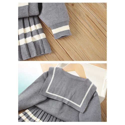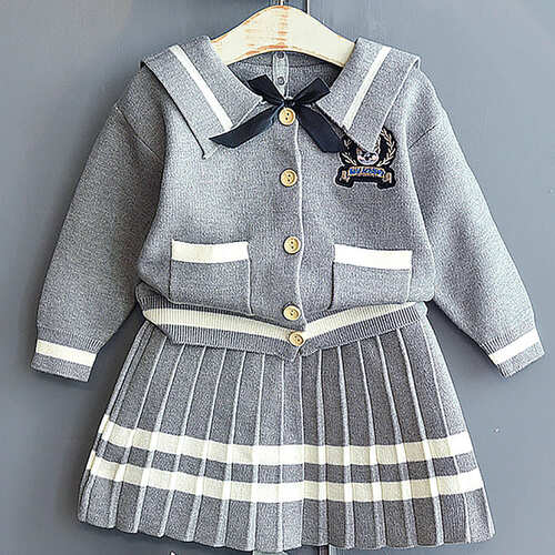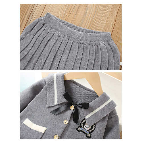 1. Chic & stylish Design: A matching 2 pc set which includes a soothing grey knitted wear plus matching woolen skirt, creating a coordinated and fashionable ensemble. the chunky crest on the right gives a classy and chic look to the piece.