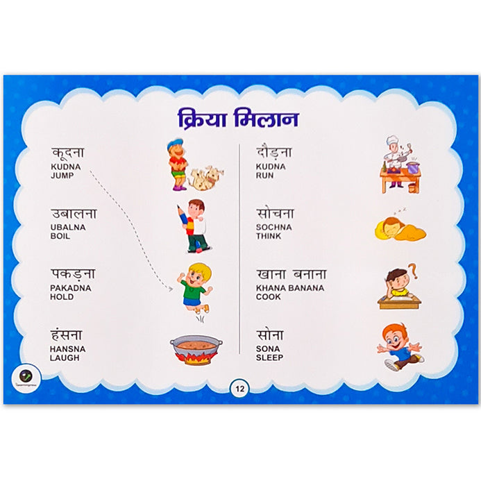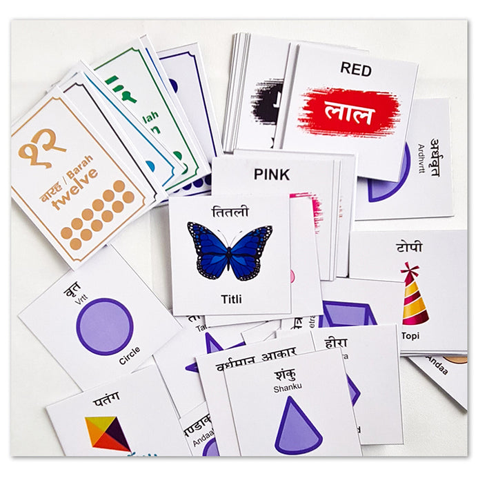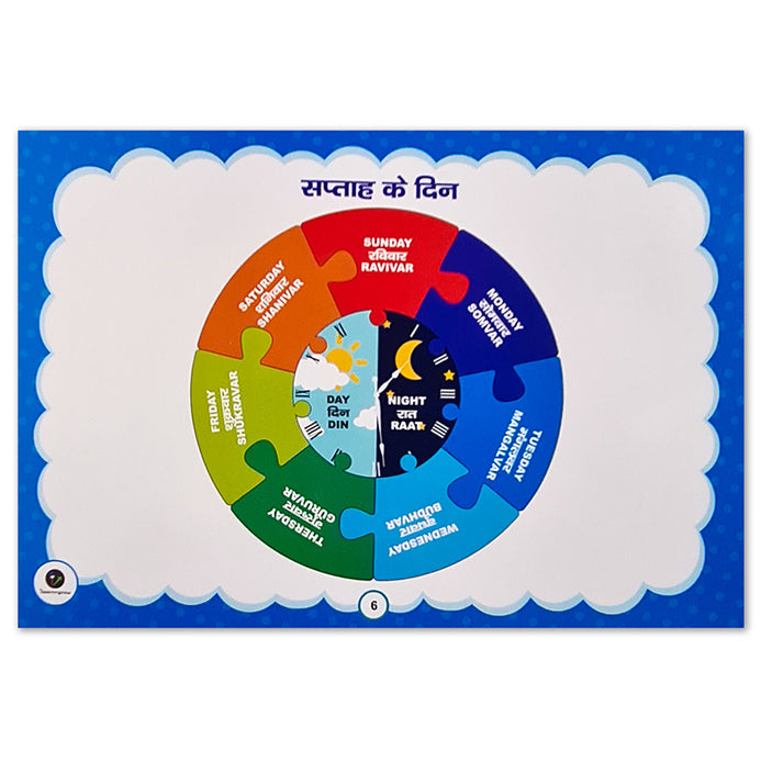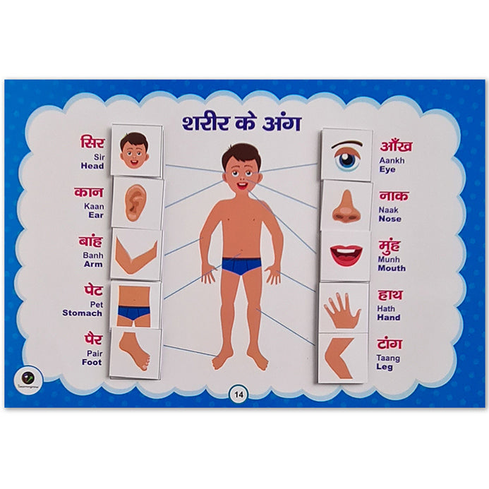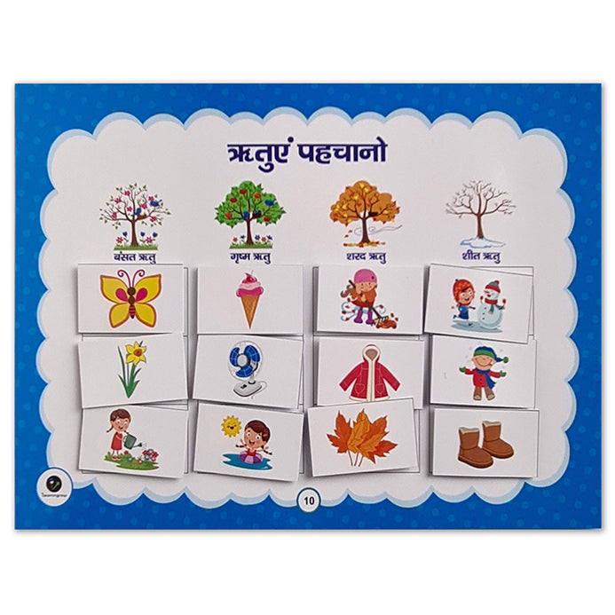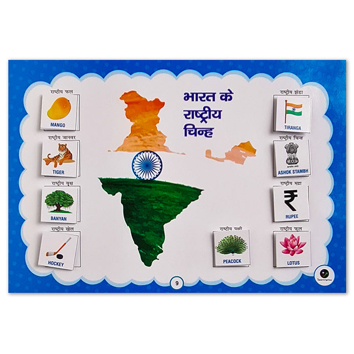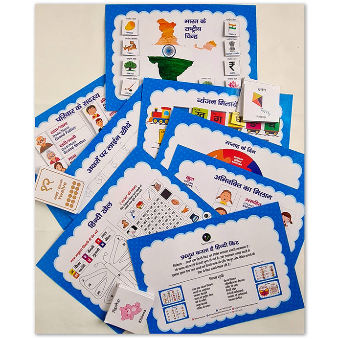 Box Contains: 20 sheets on concepts like Swar and Vyanjan ,Knowing weekdays and Months of Year ,Different Seasons , National Symbols of India ,Relationships,Understanding Human body parts,Flashcards of Colors, Shapes and Numbers
