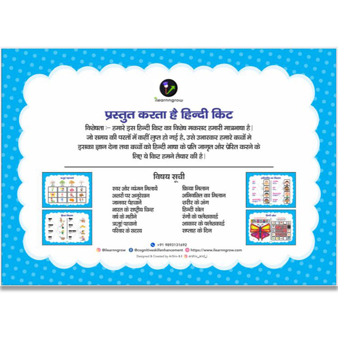This Hindi Kit covers various topics like Swar and Vyanjan, Knowing weekdays and Months of Year ,Different Seasons , National Symbols of India ,Relationships,Understanding Human body parts,Flashcards of Colors, Shapes and Numbers. This well reacsearched hindi kit contains the phonic sounds for better understanding for little genius.