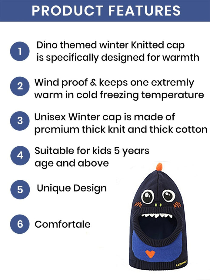1) Winter Cap : Our cute Dino themed winter Knitted cap is specifically designed for extreme warmth in freezing minus degree temperatures with extra softness protecting the head, face and neck.