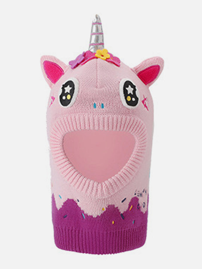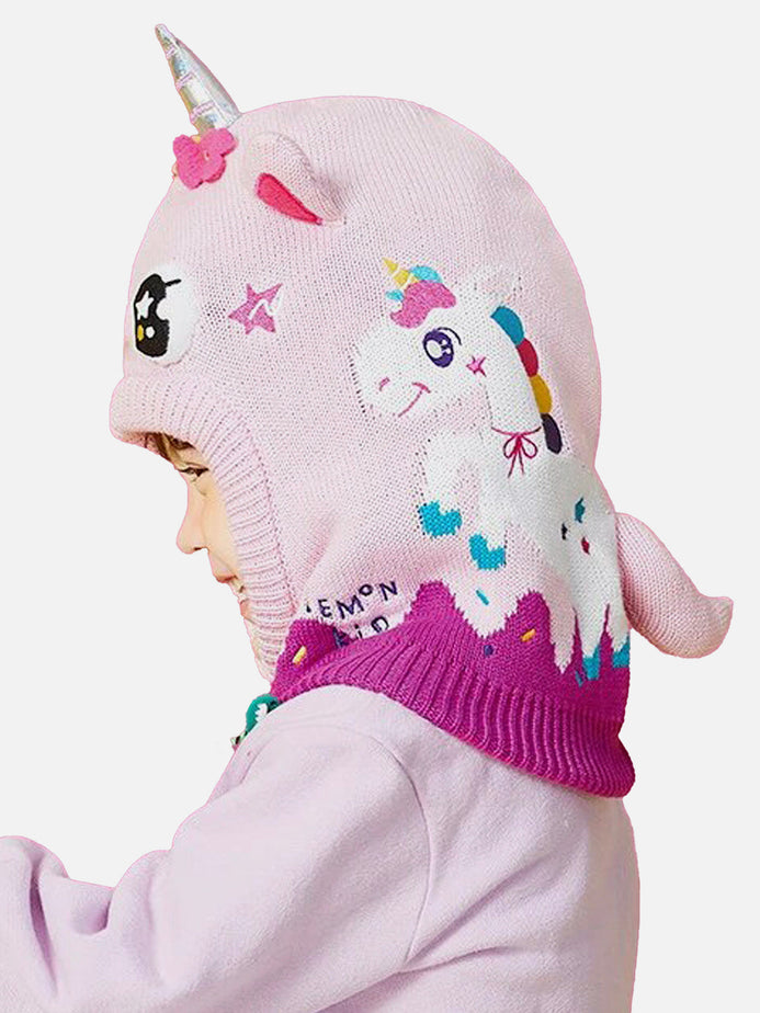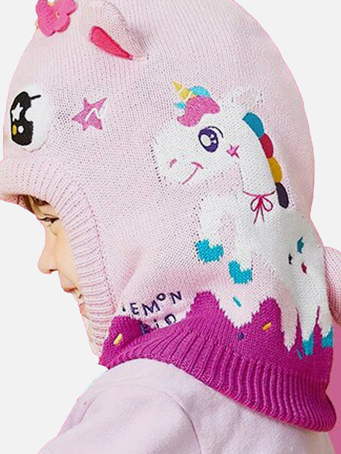 Knitted Pink Border Unicorn Theme Winter Cap Covering Neck , Ears And Head