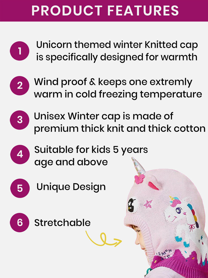 1) Winter Cap set: Our cute Unicorn themed winter Knitted cap is specifically designed for extreme warmth in freezing minus degree temperatures  with extra softness protecting the head, face and neck.
