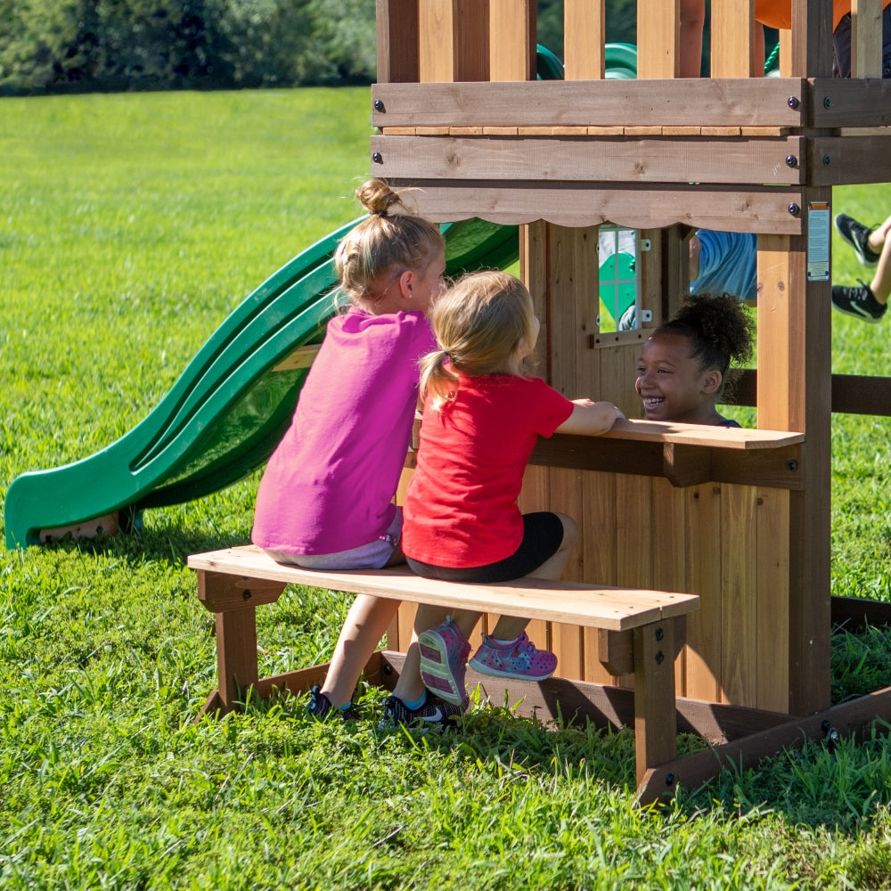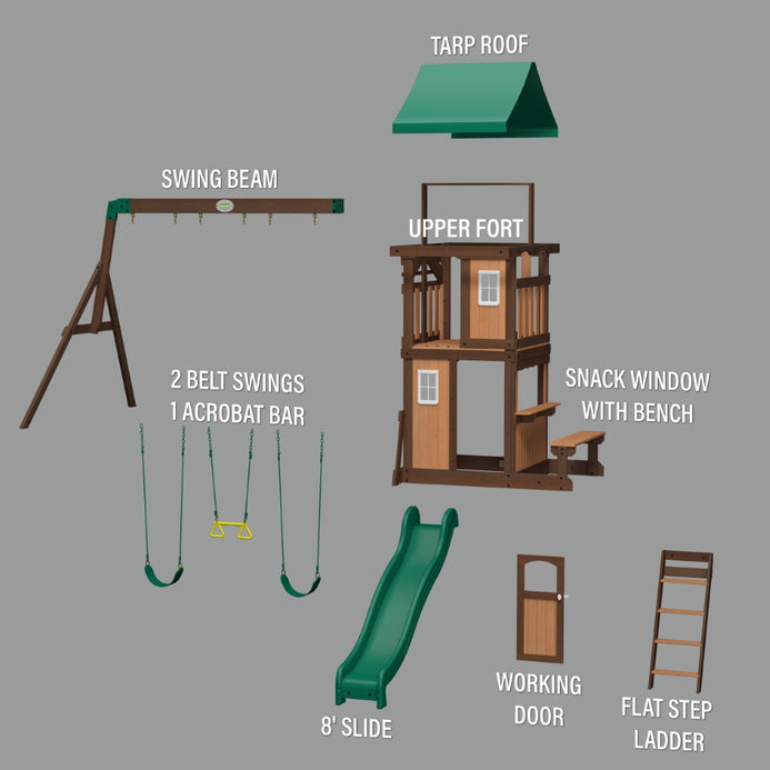 The Lakewood has some really neat features that make it great for smaller yards but keep the kids playing all day long. First, the raised fort has a colorful awning and front wall with white trimmed window to make a cool clubhouse-like area up top. Down below there is another fort, with a front wall, window, and real door! And the side snack window has built-in bench just outside. Out on the swing beam there are two belt swings and an acrobat bar for plenty of swinging and clowning around. A standard step ladder gets the kids to the upper fort and their 8' speedy slide zips them back down again.