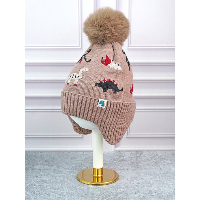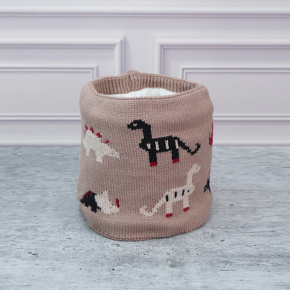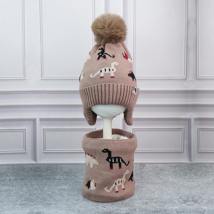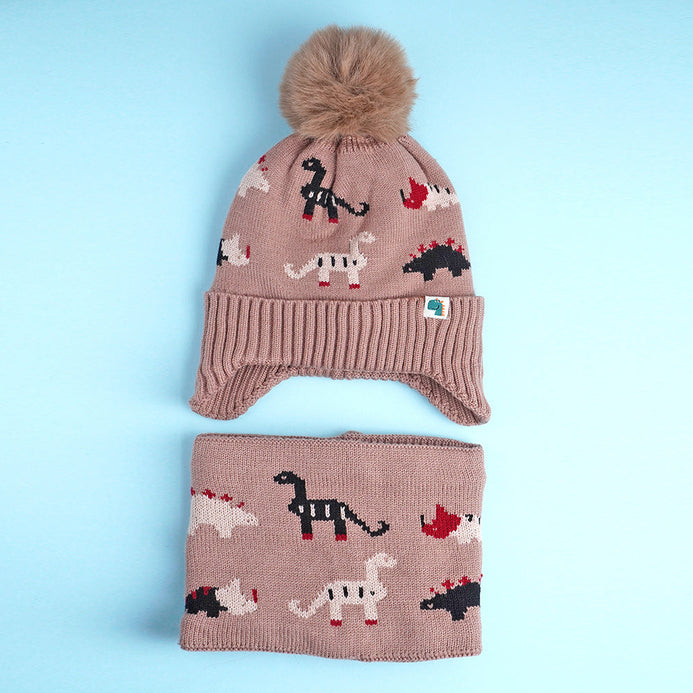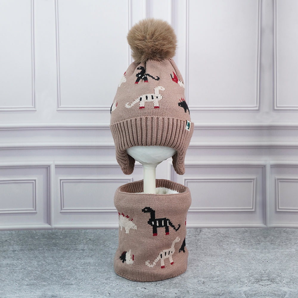 Little Surpise Box , 2Pcs Brown Dino Themed Beanie Winter Cap With Matching Neck Cuff Style Muffler | 5-15 Years