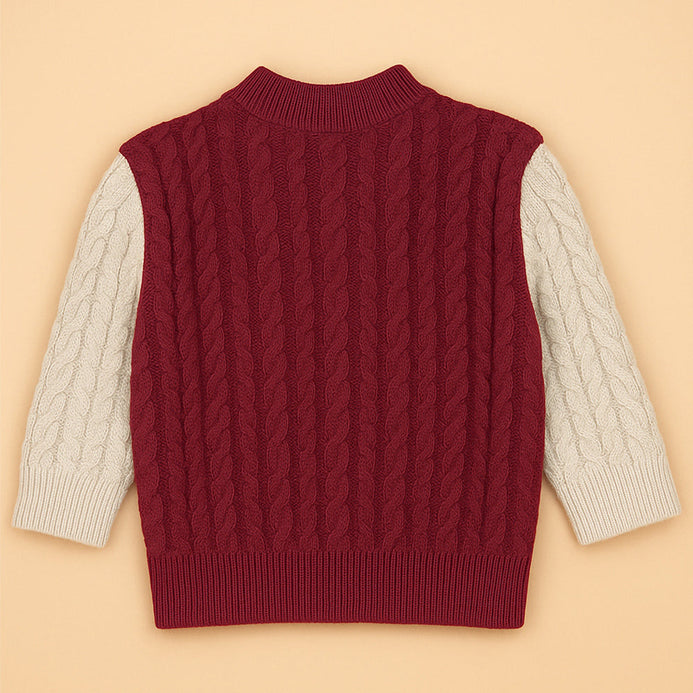 1. Design: This cosy winter sweater is perfect for little ones who love a cute and stylish look. The maroon cable-knit pullover has a bold cream letter “M” in the center and matching cream sleeves that give it a fun, sporty feel. The soft textured knit keeps your child warm and comfortable all day