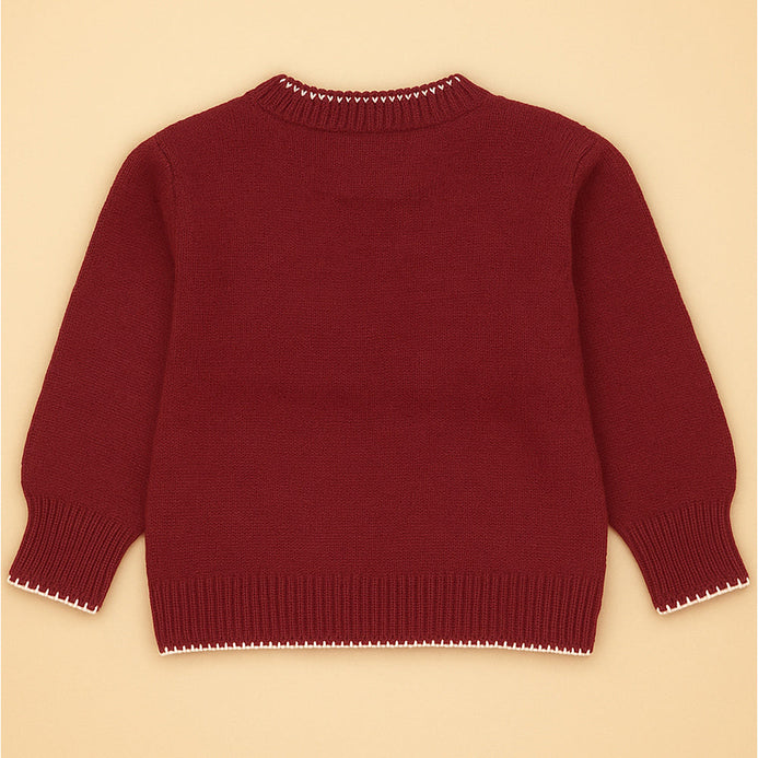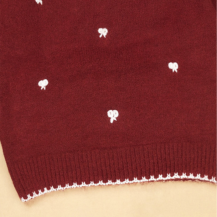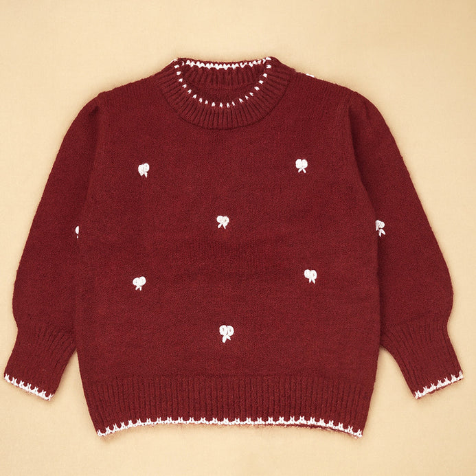 1. Design: This adorable winter sweater is designed for little ones who love a cute and charming look. The maroon pullover features delicate cream bow embroidery across the front and sleeves, adding a sweet and elegant touch.
