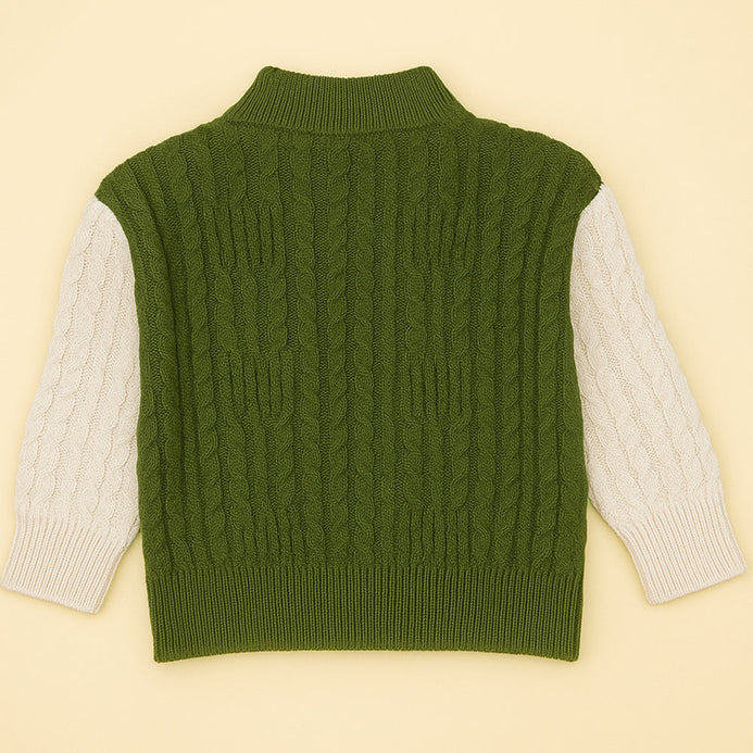 1. Design: This cosy winter sweater is perfect for little ones who love a cute and stylish look. The olive cable-knit pullover has a bold cream letter “M” in the center and matching cream sleeves that give it a fun, sporty feel. The soft textured knit keeps your child warm and comfortable all day.