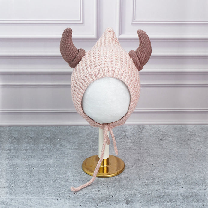 Peach Baby Horns Knitted Soft Woolen Winter Cap With Tie Up | 6-18 Months
