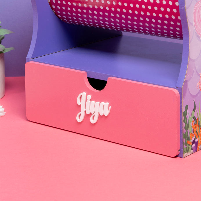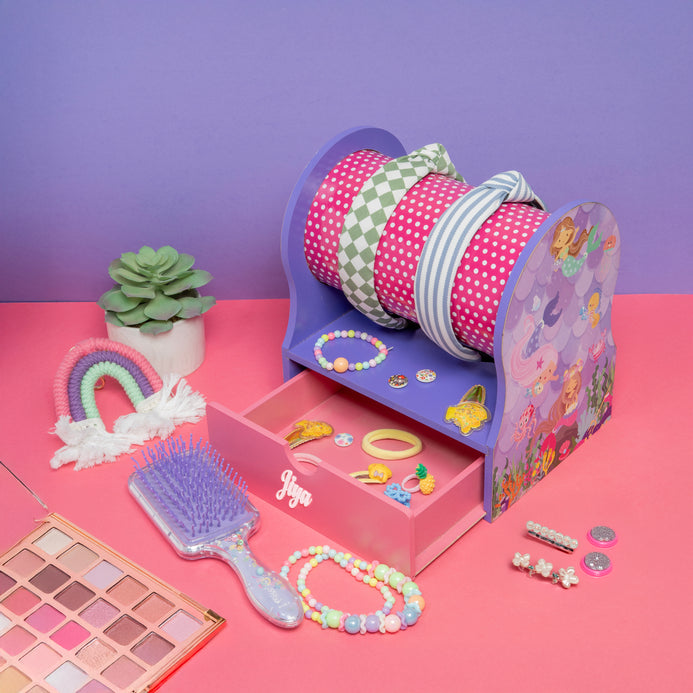 Keep your little one's dresser clutter-free with this adorable unicorn Hairband Holder with Drawer. Made of sturdy wood, this organiser is perfect for storing hairbands, pins, rubber bands, make-up, jewellery, and more. The quirky unicorn design adds a touch of fun to any room decor and makes it an attractive piece. This hairband holder is an ideal gift for girls who love to keep their accessories in one place. The added drawer is perfect for storing rubber bands and small items, and the holder can also be personalized for an extra special touch.