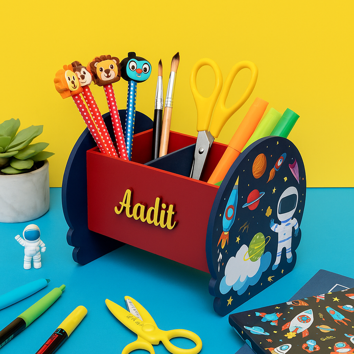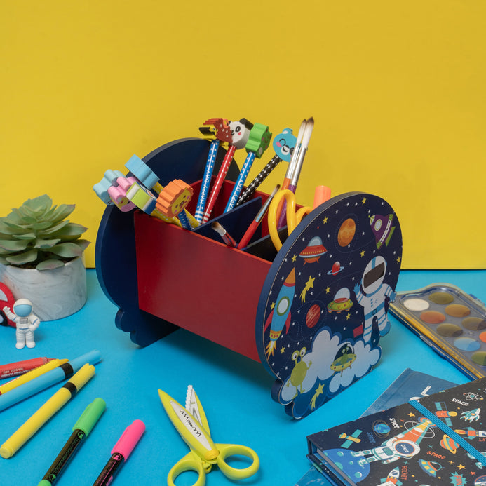 Keep your little one's desk tidy and organized with our Rectangle Pen Stand- Space Graphic! This three-compartment stationery organizer is perfect for storing pens, pencils, and other art supplies. The fun themed shape cutting on the sides of the stand will add a touch of whimsy to any kid's workspace. Whether they're working on homework or creating masterpieces, this pen stand is a must-have for any young artist. Add some fun and functionality to your child's desk with this charming pen stand.
