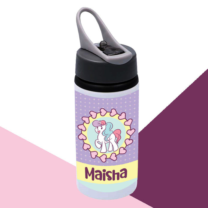 Thirsty Kids? Are they staying hydrated? Why not keep their own personalized and reusable water bottle handy at all times. Our colorful and unique designs will make your kids bottle stand out among the rest. The Theme is Printed all around the white Aluminium bottle.