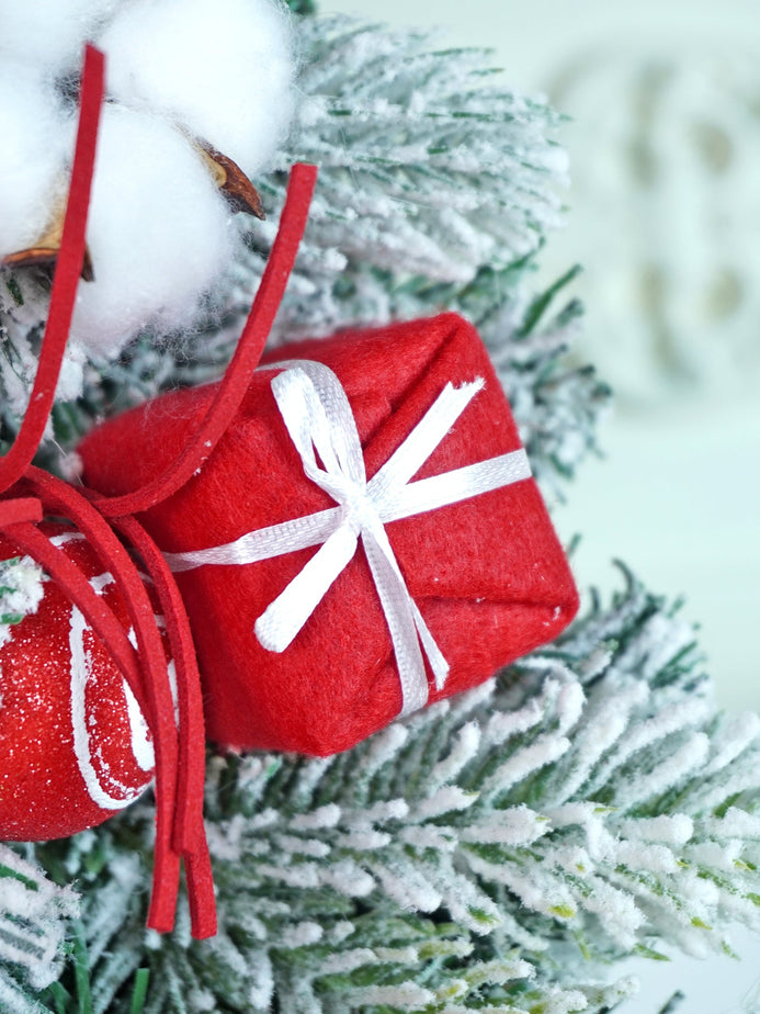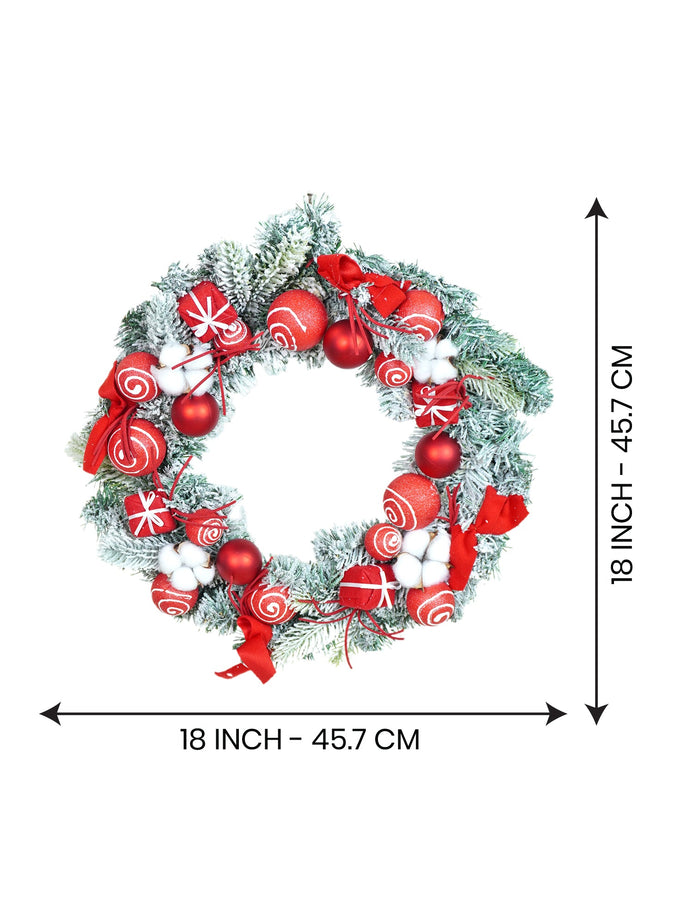 1. Unique Design : This Frosty Red & White exquisite and premium dense , bushy Wreath designed in the classic Red white theme would add volume and magic to any space where it is put. The classic and beautiful combination of Red Swirl Ball ornaments, big red Bows, realistic looking cotton stem flowers, gift Boxes, and red shiny Ball tree ornaments and thick lush greens makes it accentuate the area where it is placed.The greens add a lot of classic beauty to the piece.Just open up the branches for a more fuller and enticing look.