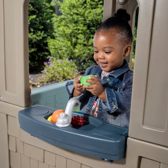 • Outdoor playhouse for toddlers features a kitchenette set and spacious interior to host dinner parties.