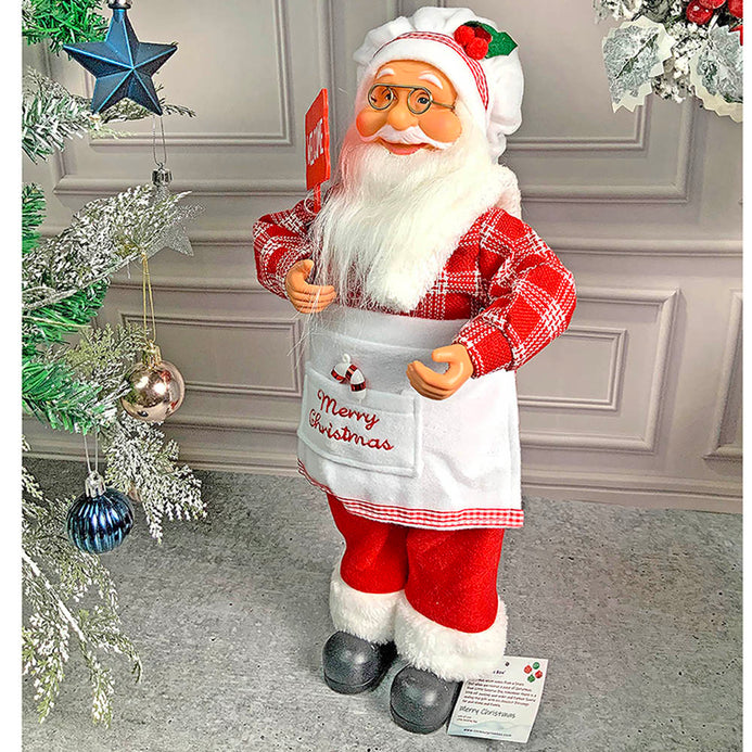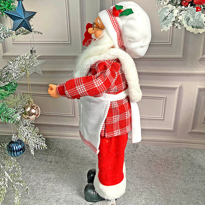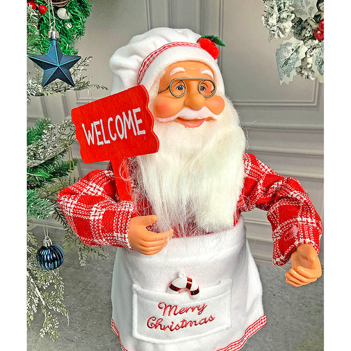1. Exclusive Design: This Exquisite and overly attractive Masterchef themed Santa in chef style clothing holding and adorning the most cutest christmas elements in the masterchef style with a matching apron, chef hat , holding a plate and a welcome signage is an eye catcher when placed on any table or your favourite corner of your house to accentuate your christmas decor. This one is a total grabber if you are looking at placing it in the kitchen or the dining table christmas layout.