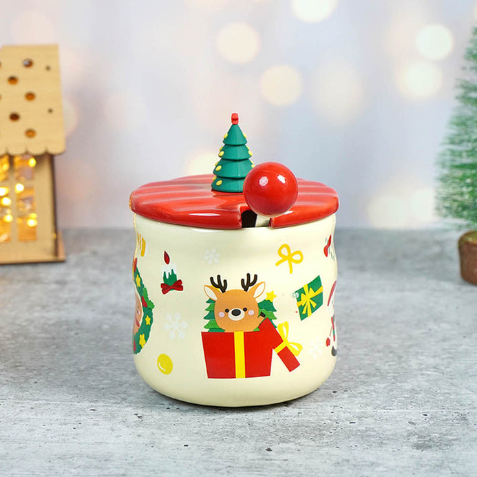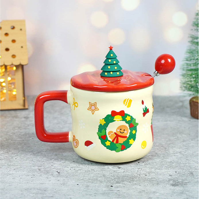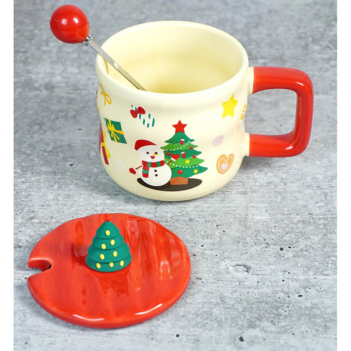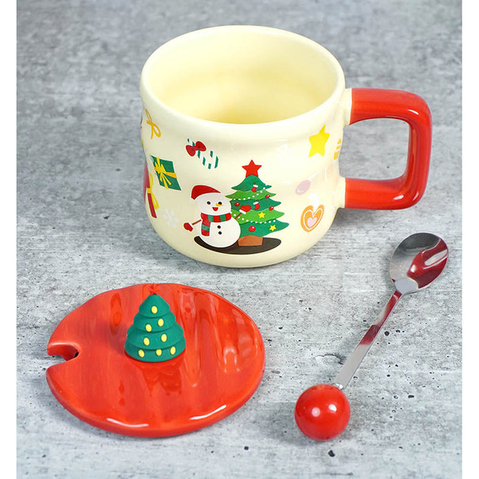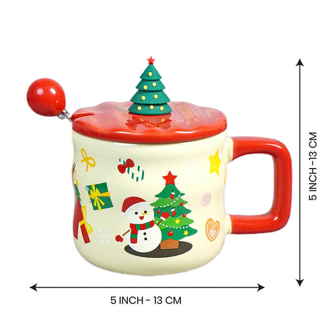 Snowman With Tree Ceramic Christmas Coffee And Hot Chocolate Mug With 3D Christmas Tree Lid And Stainless Spoon.
