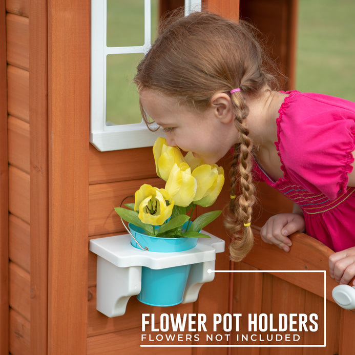 The Timberlake Playhouse is a great playhouse that the whole gang will love. It has wide windows that sunny breezes can blow through. The front is adorned with flower pot holders and a cute half-door. On one side there is a snack window for serving up cool drinks on a summer day. And inside, there are play accessories that include a sink, stove, and cordless phone. The Timberlake Playhouse assembles in as little as one hour!