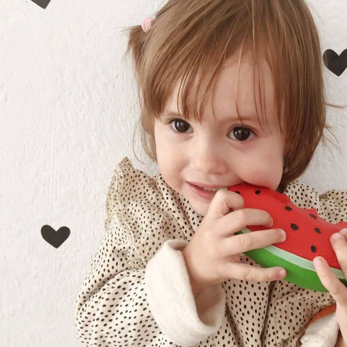 Wally the Watermelon is a fruit-shaped baby teether that will stimulate babies senses while soothing little gums. Its realistic textures will develop kids sense of touch. It is carefully hand painted with natural pigments, making it completely safe for little ones. Did you know that including watermelon in food helps keep 90% of water in human bodies? Introduce kids into a healthy lifestyle from a young age! This product is perfect as a baby teether, babies and kids toy, bath toy, for sensory play and decorative object. It is made following an artisanal, sustainable and eco-friendly process with 100% natural rubber from Hevea trees. As it is made all in one piece with no holes, it avoids the creation of bacteria inside. Hand painted with natural pigments one by one, so there are no two alike!