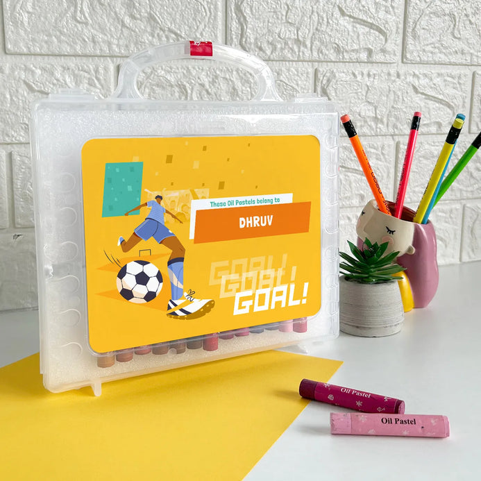 Make art time extra special with our Personalized Crayon Box, featuring a customized cover with design and name. Enjoy premium quality Faber-Castell Oil Pastels set of 50. Choose from a range of specially created designs like cricket, football, floral, unicorn, jersey number and more to customize the box. Add a personal touch with your kids name, making it perfect for sparking creativity while keeping art supplies organized in style. Ideal as a thoughtful gift for kids, birthdays, Children’s Day, back-to-school supplies, personalized return gifts, and more, this crayon box combines premium quality with a personalized flair to inspire creativity and delight every young artist. Tip: Pair it with our Custom Pencils box for the perfect Return Gift Combo!