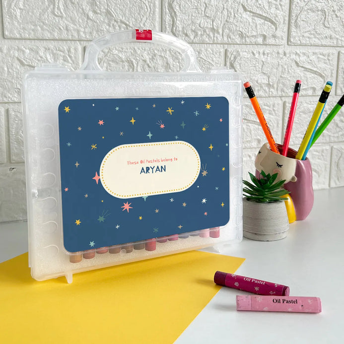 Make art time extra special with our Personalized Crayon Box, featuring a customized cover with design and name. Enjoy premium quality Faber-Castell Oil Pastels set of 50. Choose from a range of specially created designs like cricket, football, floral, unicorn, jersey number and more to customize the box. Add a personal touch with your kids name, making it perfect for sparking creativity while keeping art supplies organized in style. Ideal as a thoughtful gift for kids, birthdays, Children’s Day, back-to-school supplies, personalized return gifts, and more, this crayon box combines premium quality with a personalized flair to inspire creativity and delight every young artist. Tip: Pair it with our Custom Pencils box for the perfect Return Gift Combo!