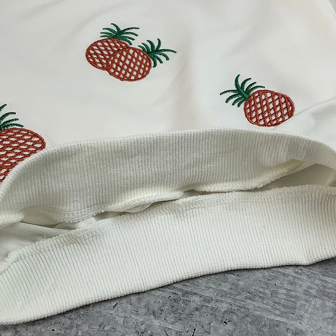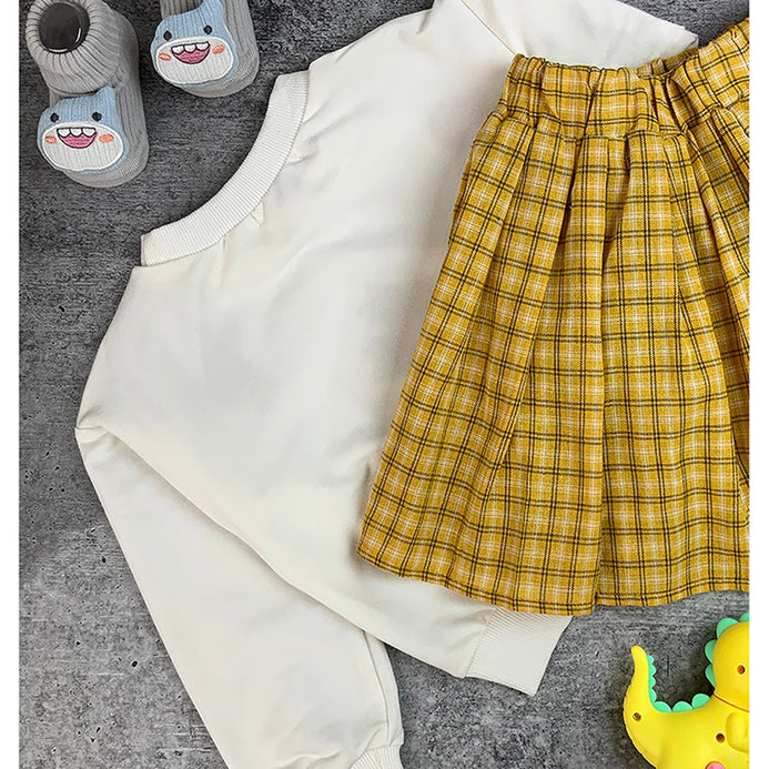 1. 2 Pcs Set: Brighten up your little one's wardrobe with this adorable Girls' Pineapple Print Sweatshirt, Skirt Set. This 2-piece outfit includes a cozy sweatshirt with cute pineapple embroidery, a yellow checkered skirt for a fun and coordinated look.