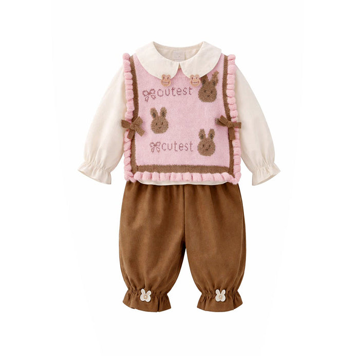 1. Adorable Design: This adorable set features a soft cream full-sleeve inner shirt with a classic rounded collar with teddy bear patches, layered with a pink knitted sleeveless vest detailed with cute teddy designs, ruffle trims, and the word “Cutest” for a playful touch.It is paired with matching brown pants finished with bunny detailing at the cuffs, creating a perfectly balanced and sweet look.