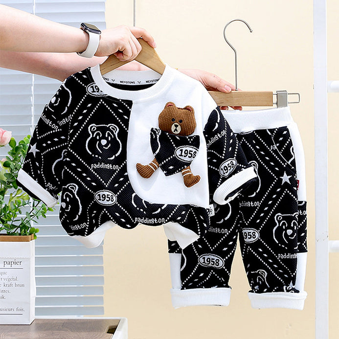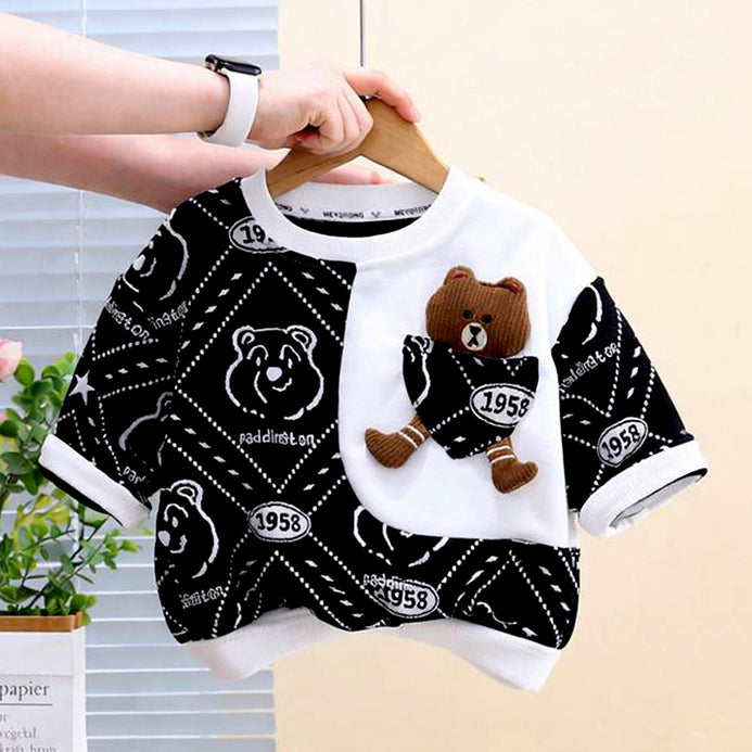 1. 3d Teddy Design: This cute tracksuit set features a black and white sweatshirt with playful bear prints, the attractive detail is an adorable 3D teddy placed inside the pocket. The fun pattern and matching look make it stylish yet adorable for everyday wear.