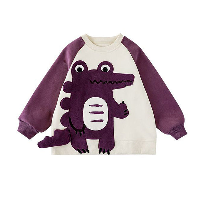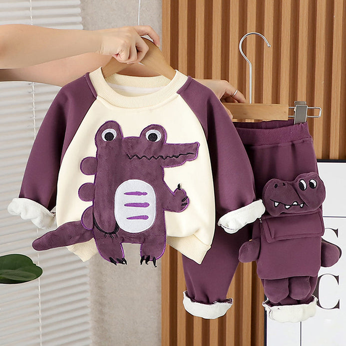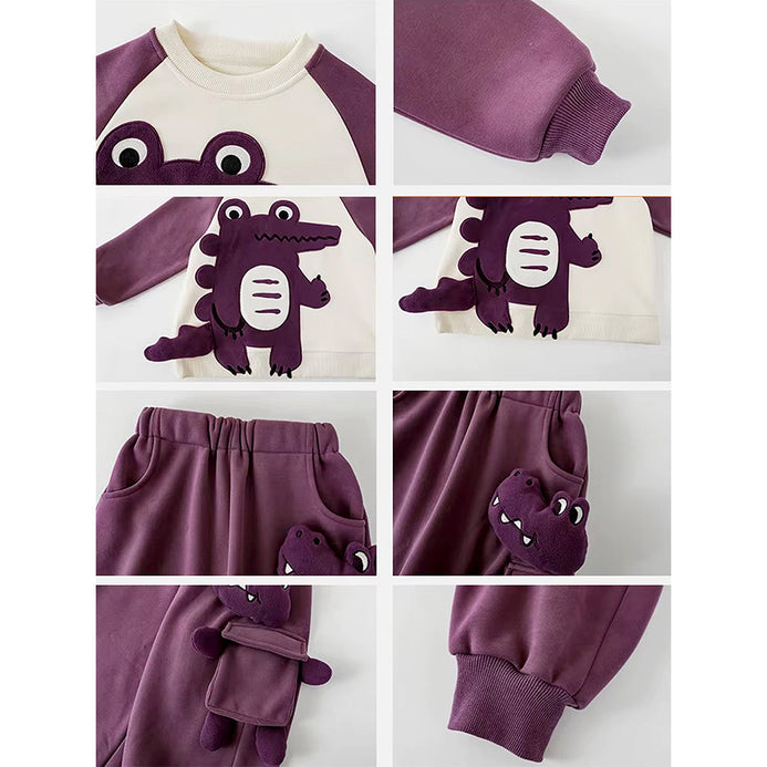1. 3d Crocodile Design: This adorable kids tracksuit set features a cream and purple sweatshirt with a cute 3D crocodile on the front, paired with matching purple pants. The crocodile-shaped 3D pocket on the pants, adds a fun, interactive element that kids will love.
