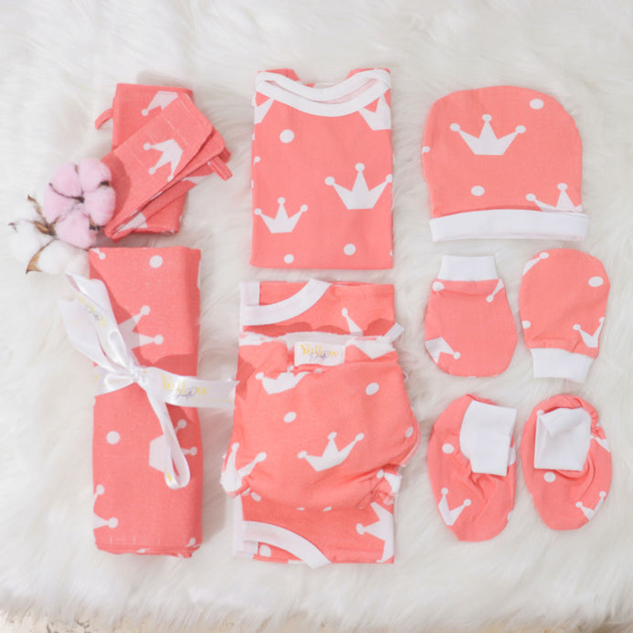 • Set of 11 : 1 Cotton Cap, 1 pair of mittens, 1 pair of booties, 1 babywear set (nappy & vest), 1 bodysuit, 1 luxury swaddle, 2 muslin wipes.