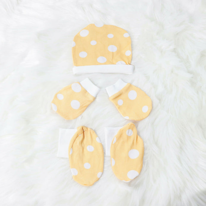 Each piece is not only made with premium cotton, but also features flat seam stitching so that thereàno irritating inner seams, non-toxic printed labels means thereàno itchy tags, double stitching ensures durability and comfy enough as your baby grows. Made of 100% cotton, beautiful colours and adorable designs; this cap, mittens & booties set will keep your baby safe and fashionable.