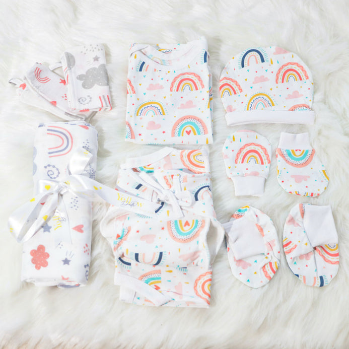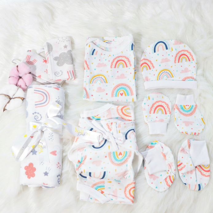 - Set of 11 : 1 Cotton Cap, 1 pair of mittens, 1 pair of booties, 1 babywear set (nappy & vest), 1 bodysuit, 1 luxury swaddle, 2 muslin wipes.